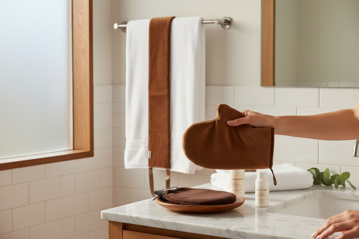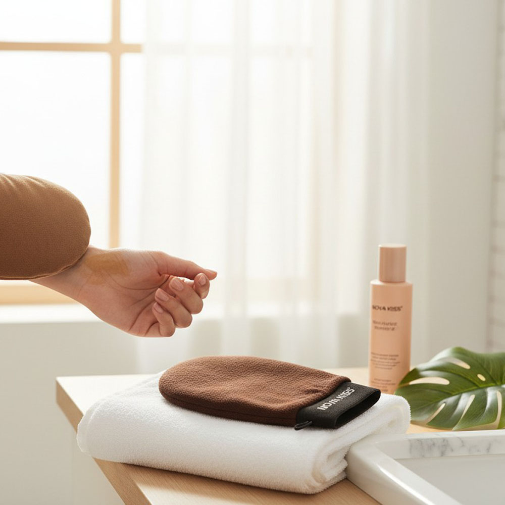 Set Profesional pentru Bronzare Fără Urme NOVA KISS® Tan Like a Pro, cu Mănușă Autobronzantă, Mănușă Exfoliantă și Aplicator Spate