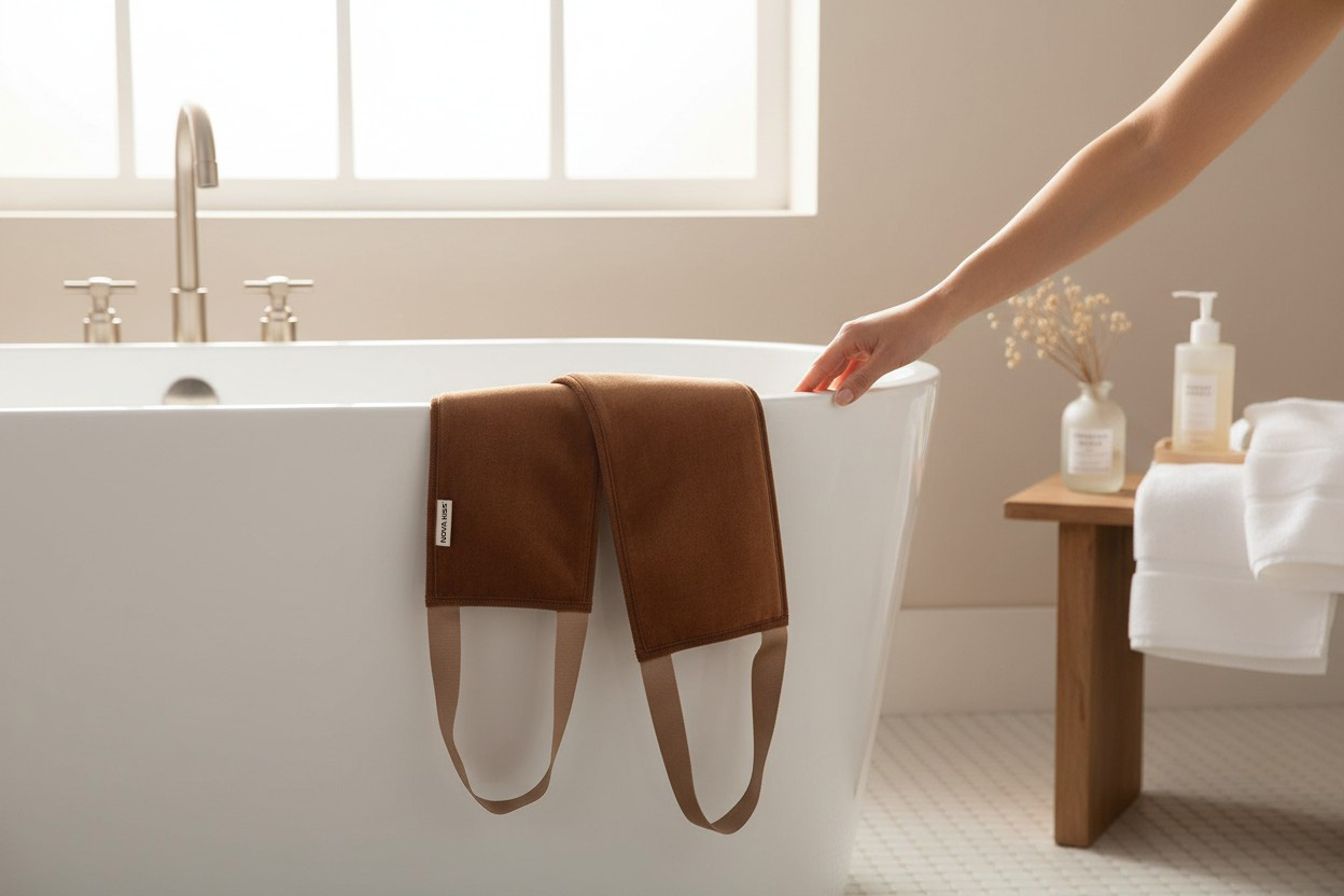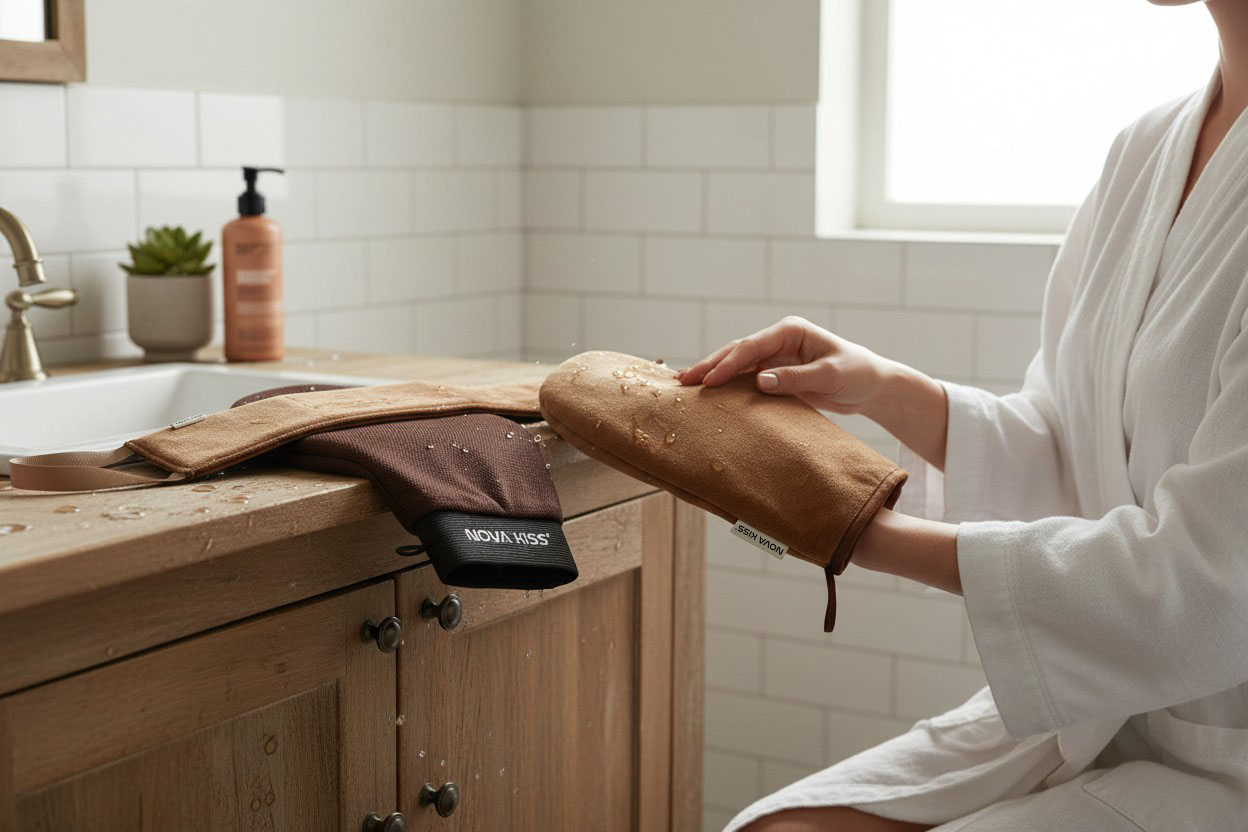 1. Exfoliază pielea în apă caldă cu mănușa din viscoză.
