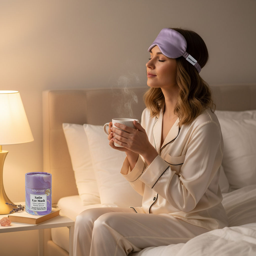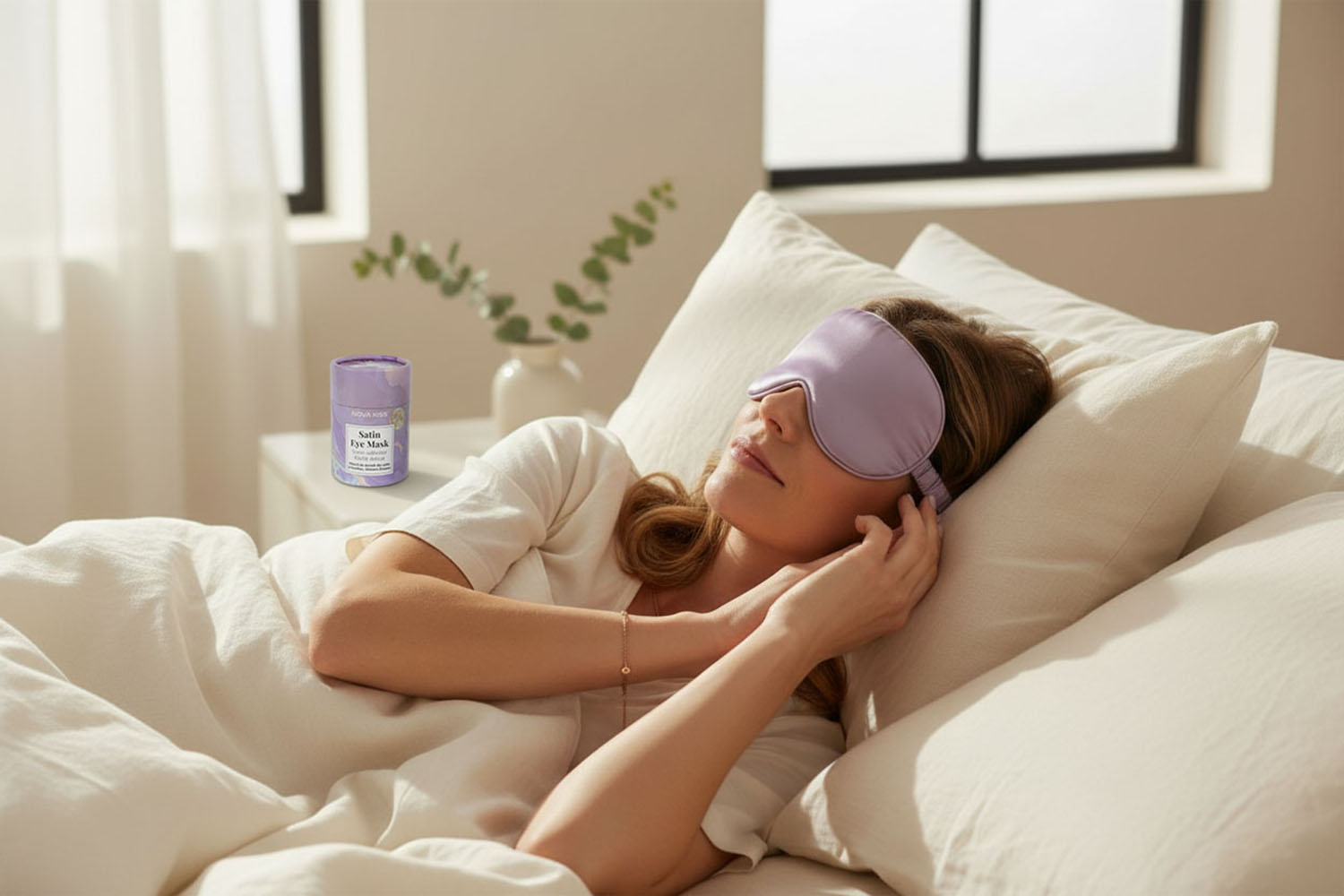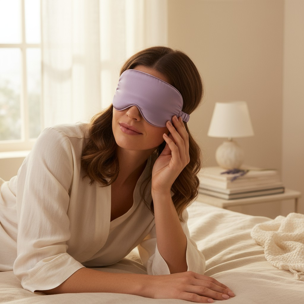 Masca de dormit realizată din satin fin și bumbac natural, oferă protecție delicată împotriva luminii, susținând relaxarea completă și îngrijirea pielii.