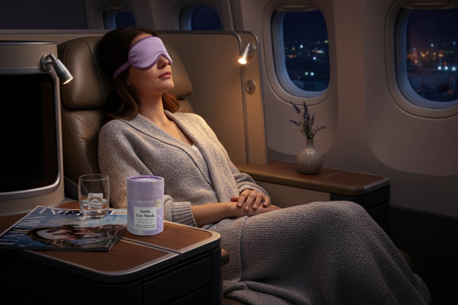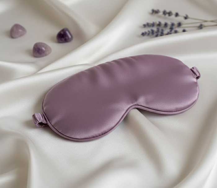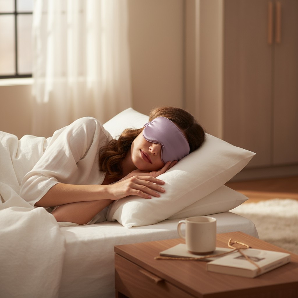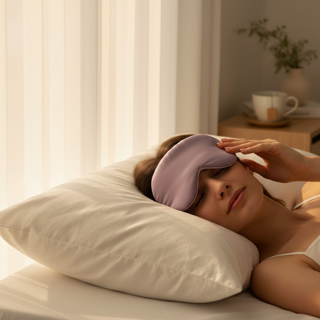 Masca de dormit realizată din satin fin și bumbac natural, oferă protecție delicată împotriva luminii, susținând relaxarea completă și îngrijirea pielii.