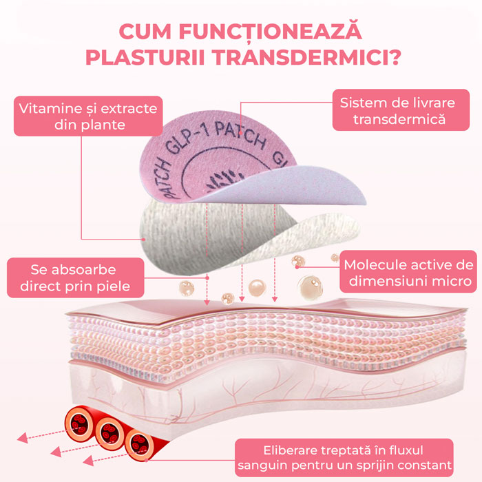 Plasturii GLP-1 reprezintă o soluție modernă pentru susținerea procesului de slăbire. Datorită tehnologiei transdermice, ingredientele sunt eliberate treptat, contribuind la reducerea apetitului, controlul poftelor și echilibrarea nivelului glicemiei, pentru un suport constant în gestionarea greutății.