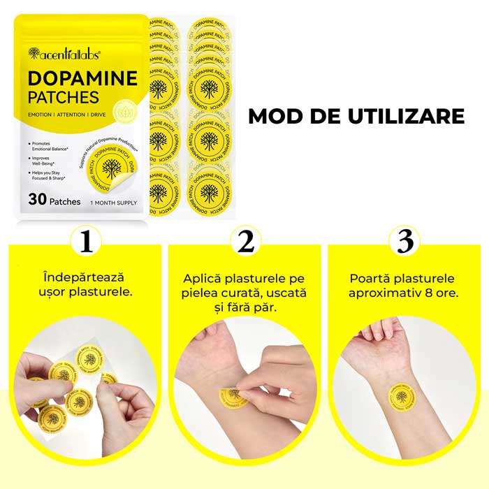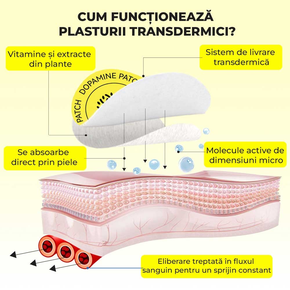 Susține echilibrul emoțional, concentrarea și starea de bine cu plasturii pentru Dopamina, o formulă inovatoare transdermică, concepută pentru eliberarea treptată a ingredientelor active direct către organism, fără a trece prin sistemul digestiv. Acești plasturi combină extracte naturale cu ingrediente funcționale pentru susținerea sănătății mentale și emoționale, sprijinind vitalitatea zilnică și claritatea mentală. Aceștia reprezintă o soluție practică pentru persoanele care doresc să-și îmbunătățească focusul, echilibrul emoțional și starea generală de bine, într-un mod natural și sigur.