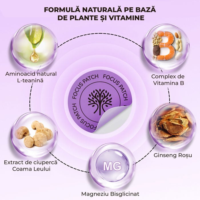 concentrarea, claritatea mentală și starea de calm cu plasturii FOCUS, o formulă transdermică inovatoare concepută pentru a susține performanța mentală și echilibrul emoțional pe parcursul zilei.
