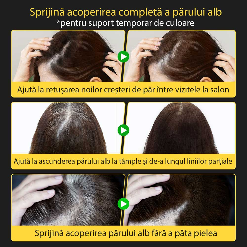 conceput pentru a acoperi rapid și uniform rădăcinile crescute și firele albe, oferind un aspect îngrijit în câteva secunde.